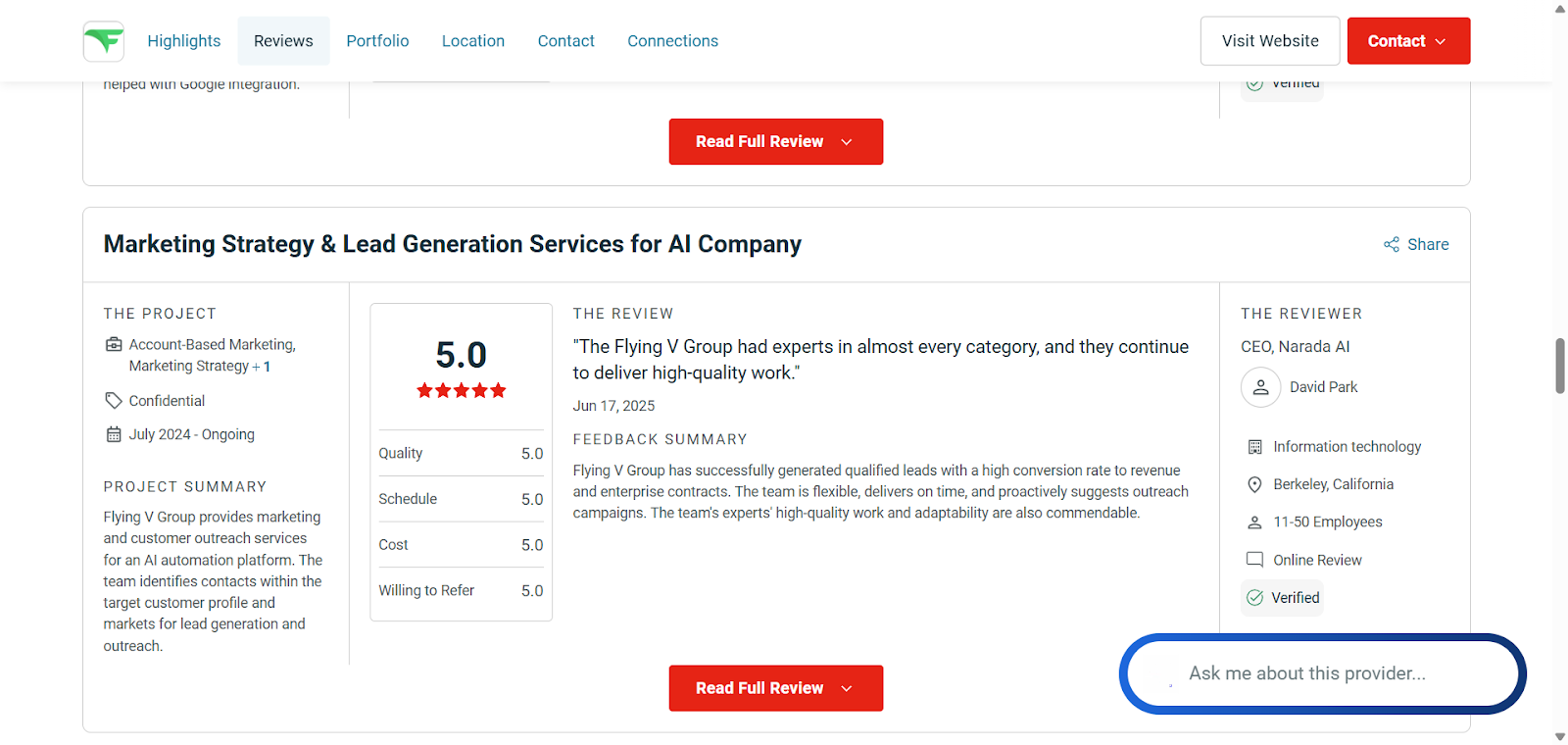 Clients highlight that Flying V Group has successfully generated qualified leads with a high conversion rate to revenue and enterprise contracts. The team is flexible, delivers on time, and proactively suggests outreach campaigns. The team's experts' high-quality work and adaptability are also commendable.