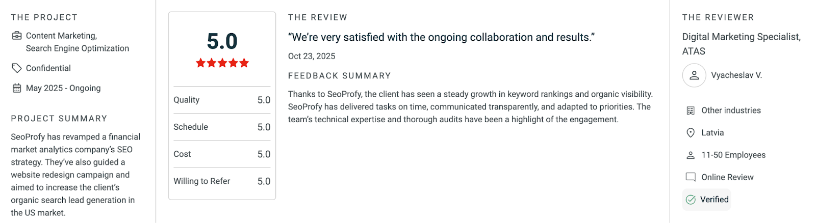 - Awards: Clutch Top SEO Company 2024 (5☆ rating), Clutch "Spring Leader" award, Inc. 5000 list (U.S.) in recent years
