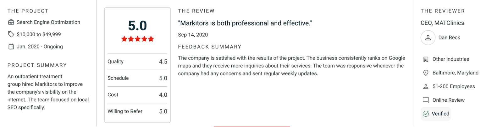 The first cut removed agencies without verified reviews on Clutch or G2. If they don't have client feedback on trusted platforms, I can't verify their claims. From there, I analyzed review patterns to understand what clients actually say about each agency's strengths. I looked for mentions of patient acquisition, local search improvements, and conversion rate optimization, not just generic "great service" comments.