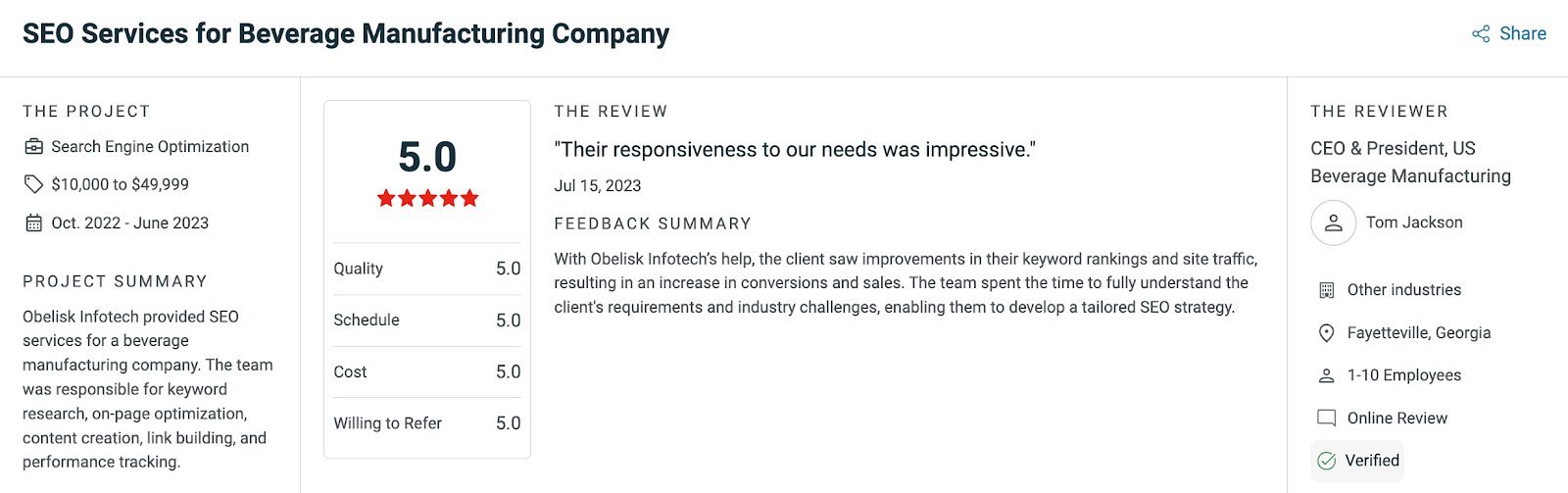 Clients consistently highlight Obelisk Infotech’s responsiveness, clear communication, and precision in executing SEO tasks. Reviews frequently mention reliable delivery, transparent reporting, and measurable improvements in organic visibility, especially for local and service-based SEO campaigns.