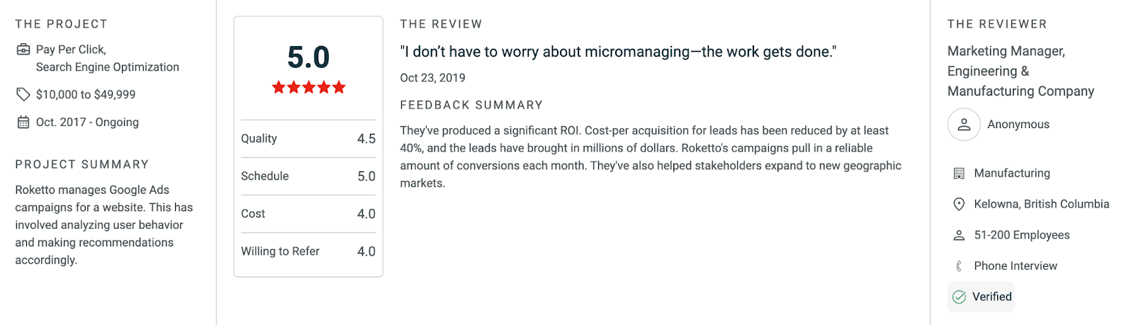 Clients mention strong ROI, higher conversions, and deep expertise.