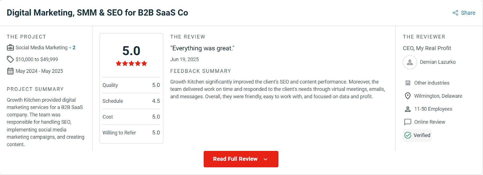 From there, I analyzed review patterns to understand what clients actually say about their work. I looked for specific mentions of SaaS results, not just generic SEO praise.